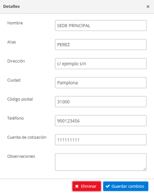 Si pinchamos en cualquiera de los datos (Nombre, Alias, Dirección, Ciudad, Código Postal, C. Cotización o Teléfono), se nos abrirá una ventana emergente en la que podremos modificar los datos de la sede.