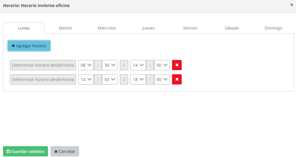 Una vez terminado, le damos al botón verde Guardar cambios y volveremos al menú anterior, donde tendremos un resumen de los horarios creados.