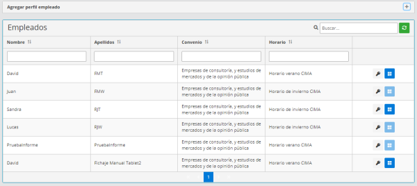 En la parte inferior, aparecerán los horarios que tengamos dados de alta. Veremos el nombre del nombre del horario y los empleados asociados a ese horario. Con el botón del reloj de la derecha, accederemos de nuevo al menú de edición de horario (como en la imagen anterior).