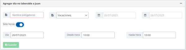 Se pueden solicitar los días no laborales por día completo o por horas. Si habilitamos la opción Sólo horas se abrirá una nueva ventana donde tendremos que especificar desde qué hora y hasta qué hora.