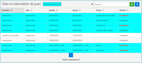 Si los ha solicitado el usuario, aparecerán marcadas en color azul. Si las rechaza el administrador, aparecerá toda la línea en rojo.