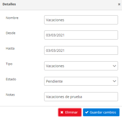 Si pinchamos en cualquiera de los días, se abrirá una ventana emergente, donde podremos modificar el nombre, la fecha desde hasta, el tipo de día, el estado y si queremos añadir alguna nota.