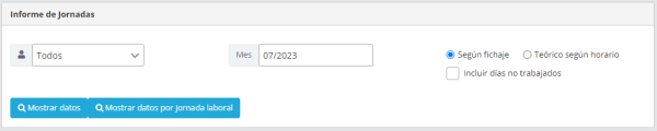 A continuación, podemos elegir entre Mostrar Datos y Mostrar datos por jornada laboral. La diferencia, es que los trabajadores que van de noche y alguno de los movimientos es posterior a las 00:00, con el primer botón lo desglosaría en 2 días y con el segundo botón lo agrupa en una jornada.