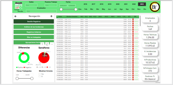 En el primero de los informes, podremos ver un resumen por empleados, de los movimientos (entrada y salida) del día. Mediante los filtros de arriba, podremos filtrar por año, mes, rango de fechas concretas, por sedes, puestos de trabajo, empleados y que nos muestre o no los errores. Según vayamos aplicando los filtros, irán variando en tiempo real tanto los indicadores de la derecha (KPIs), así como los registros (en medio), y los semáforos (abajo izquierda).