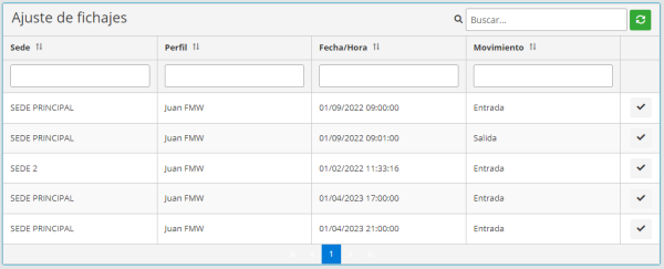 En este menú, podremos “corregir” los fichajes de primer día de mes que correspondan al último día del mes anterior, de los trabajadores que van de noche. Habrá que pinchar sobre el √ de la derecha para especificar que ese fichaje corresponde al mes anterior.