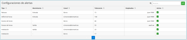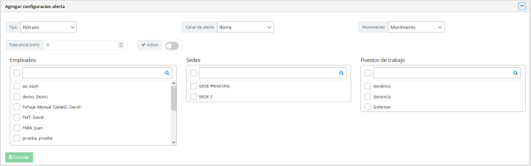 A la hora de configurar las alertas, los campos que nos va a pedir son el tipo (retraso, antelación, déficit de horas o exceso de horas), movimiento (entrada, salida o ninguno (para los que sean déficit de horas y exceso de horas)), canal (elegir de los creados anteriormente), tolerancia en minutos, elegir el empleado (pudiendo elegir uno o varios empleados, por sedes o por puestos de trabajo) y si está activo o no.