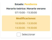 - Si el cambio está pendiente de confirmación o revisión, aparecerá Estado: Pendiente y, en el recuadro amarillo, las Modificaciones que se han propuesto para ese día (nuevas franjas horarias).