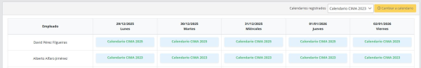 En cada celda veremos el calendario que tiene asignado ese empleado para ese día (por ejemplo, Calendario CIMA 2023 o Calendario CIMA 2025).