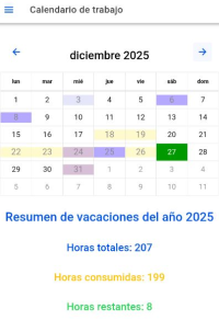 Debajo del calendario, salen también los días/horas de vacaciones correspondientes de cada trabajador (si se lo hemos especificado en su ficha de empleado). Además, según se vayan aprobando las vacaciones, pondrá las consumidas y las restantes.