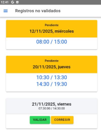 En estos casos podremos: - Pulsar VALIDAR para confirmar la jornada. - Pulsar CORREGIR para modificar los horarios manualmente.