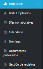 En el siguiente gran menú, gestionaremos todo lo relativo a los empleados (perfil empleados, días no laborables, calendario, nóminas, documentos publicados y gestión de registros).