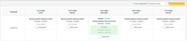 En la parte superior derecha de la tabla encontramos un desplegable con los Horarios registrados y el botón amarillo Cambiar a horario.