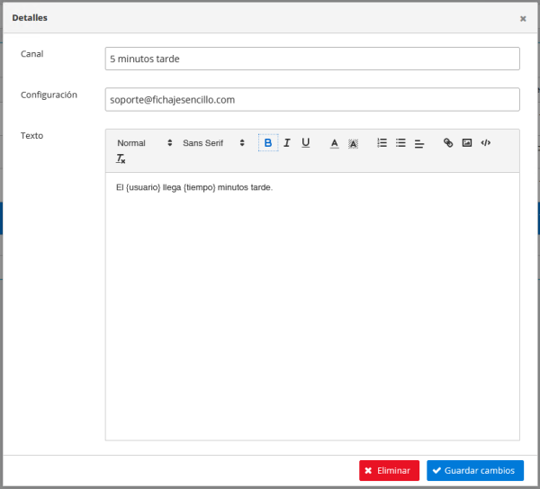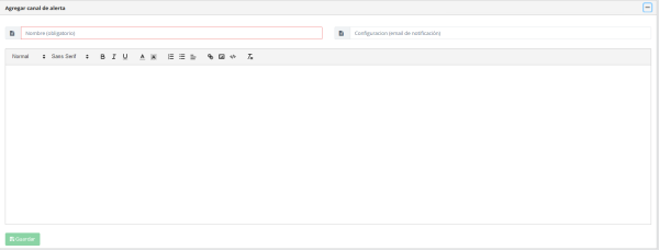 Los campos que nos va a pedir son un nombre para el canal, la configuración (el correo electrónico al que se va a mandar las alertas que tengan este canal asignado) y el texto. En el texto, podremos utilizar las variables {usuario} y {tiempo}. Tenemos un editor html, en el cual podremos dar los estilos que queramos.