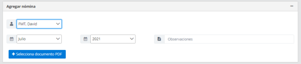 Aquí podremos subir la nómina de cada uno de los empleados. Tendremos que elegir el nombre del trabajador, el mes y el año al que corresponde y si queremos añadir alguna observación.