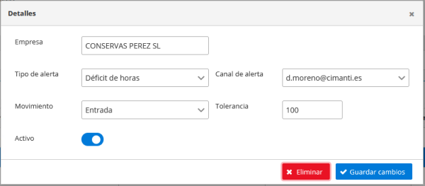 A la hora de configurar las alertas, los campos que nos va a pedir son el tipo (retraso, antelación, déficit de horas o exceso de horas), movimiento (entrada, salida o ninguno (para los que sean déficit de horas y exceso de horas)), canal (elegir de los creados anteriormente), tolerancia en minutos, elegir el empleado (pudiendo elegir uno o varios empleados, por sedes o por puestos de trabajo) y si está activo o no.