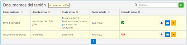 Los botones de la derecha serán comunes para cualquiera de los dos casos, mediante los cuales (de izquierda a derecha), podremos descargar el documento que hemos adjuntado a la hora de mandar el aviso, volver a mandar la notificación y por último eliminar la notificación.