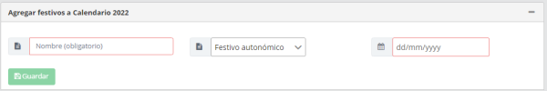 Con el botón azul de la derecha, daremos de alta los festivos. Los datos que nos pedirán son el nombre, el tipo de día y el día.
