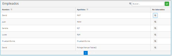 Desde aquí gestionaremos las vacaciones, bajas, visitas médicas… que solicita el usuario. Nos aparecen un listado con todos los usuarios, donde veremos su nombre y apellidos. A la derecha, con el botón de la lupa, podremos desglosar cada trabajador para consultar, añadir, modificar y borrar tantos días como queramos.