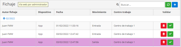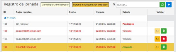- Si el usuario tiene configurado el modo registro de jornada, nos aparecerán todos los registros hechos con web/app. De izquierda a derecha, los campos que veremos son autor del registro (por defecto el trabajador, si los modifica o añade el administrador, se coloreará toda la línea en amarillo), la fecha, el horario y el estado. Por defecto el estado siempre es validado. Si eliminamos un registro, dejará de contabilizar en los informes, pero siempre quedará constancia aquí de que ha existido un registro, y aparecerá tachado en rojo. Además, si el trabajador ha solicitado una rectificación de horario, nos apareerá toda la línea de color amarillo. Aparecerá a la derecha del todo un botón verde para validar esta corrección. Cada vez que un trabajador nos solicite una modificación de su jornada diaria, nos llegará un email avisándonos.