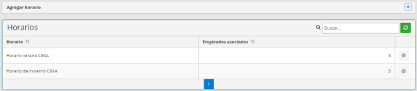 En la parte inferior, aparecerán los horarios que tengamos dados de alta. Veremos el nombre del nombre del horario y los empleados asociados a ese horario. Con el botón del reloj de la derecha, accederemos de nuevo al menú de edición de horario (como en la imagen anterior).