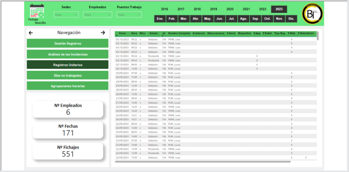 En el informe de registros unitarios, podremos filtrar por año, mes, rango de fechas, sedes, puestos de trabajo y empleados.