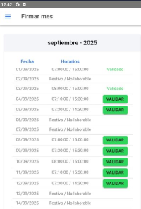 Nos aparecerá un desplegable con todos los meses anteriores, empezando con el mes en el que nos dimos de alta en la aplicación. Si desplegamos uno de los meses, nos aparecerá un listado con todos los días de ese mes indicándonos la fecha, el horario y si ese día está validado, está pendiente de validar, o si es festivo / no laborable / vacaciones.