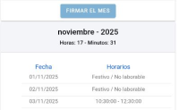 En este tercer menú, podremos ver el histórico de registros y fichajes de los meses anteriores, así como firmar el mes.