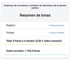 Cargará un resumen con las horas, donde nos desglosará las horas de registro, las horas de fichaje y el total de horas. Si sólo utilizamos la modalidad de registro, las horas de fichaje saldrán a 0, y viceversa. Si hemos estado unos días en modalidad registro y otros en modalidad fichaje, nos las desglosará y después sumará el total. Saldrá también una línea con las horas teóricas, basado en las horas que marca el horario que tenemos asignado, hasta un total de las horas que nos marca el convenio.