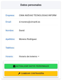 En este menú, podremos cambiar la información personal del usuario. El único campo que no puede ser modificado es el correo electrónico y la empresa. Una vez hechos los cambios, tendremos que darle al botón verde actualizar datos personales. Desde aquí podremos cambiar también la contraseña, pinchando sobre el botón amarillo cambiar contraseña. Nos pedirá escribir la nueva contraseña y volver a escribirla para confirmar.
