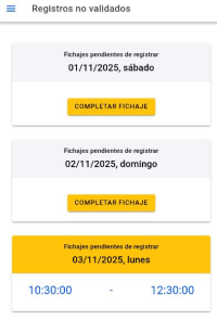 Si algún día no se ha completado correctamente el fichaje (por ejemplo, falta la salida), aparecerá como Fichajes pendientes de registrar.