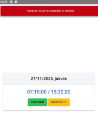 En estos casos podremos: - Pulsar VALIDAR para confirmar la jornada. - Pulsar CORREGIR para modificar los horarios manualmente.